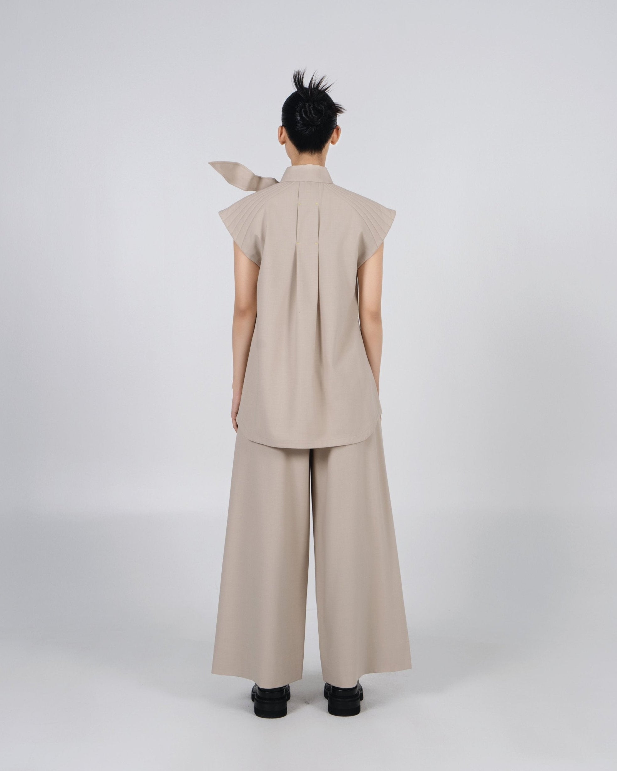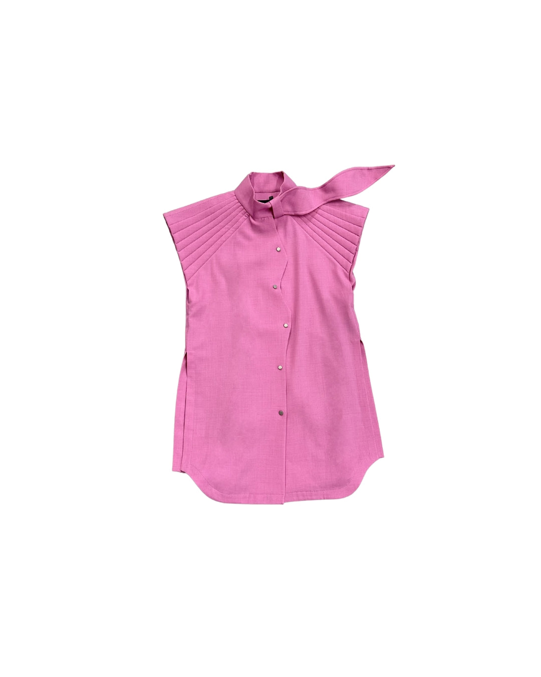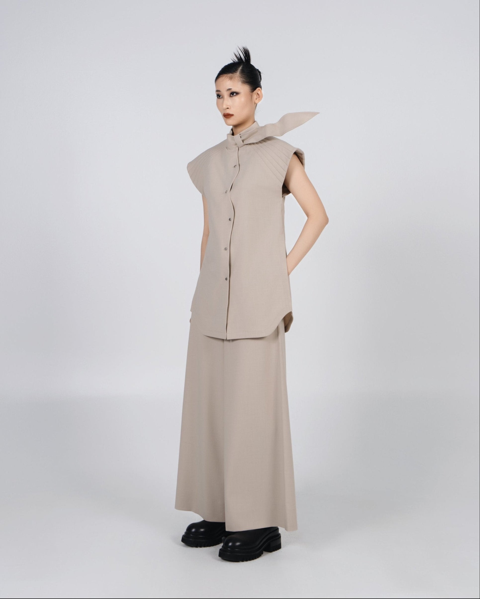 A-JANE Baroq shirt with high and long wire wavy collar exudes elegance, while the classic A-JANE line stitch padded shoulder ensures comfort and structure. Featuring a modern wavy placket with metal logo snap button, this shirt is both chic and comfortable with its high side slits and stress-free fabric.