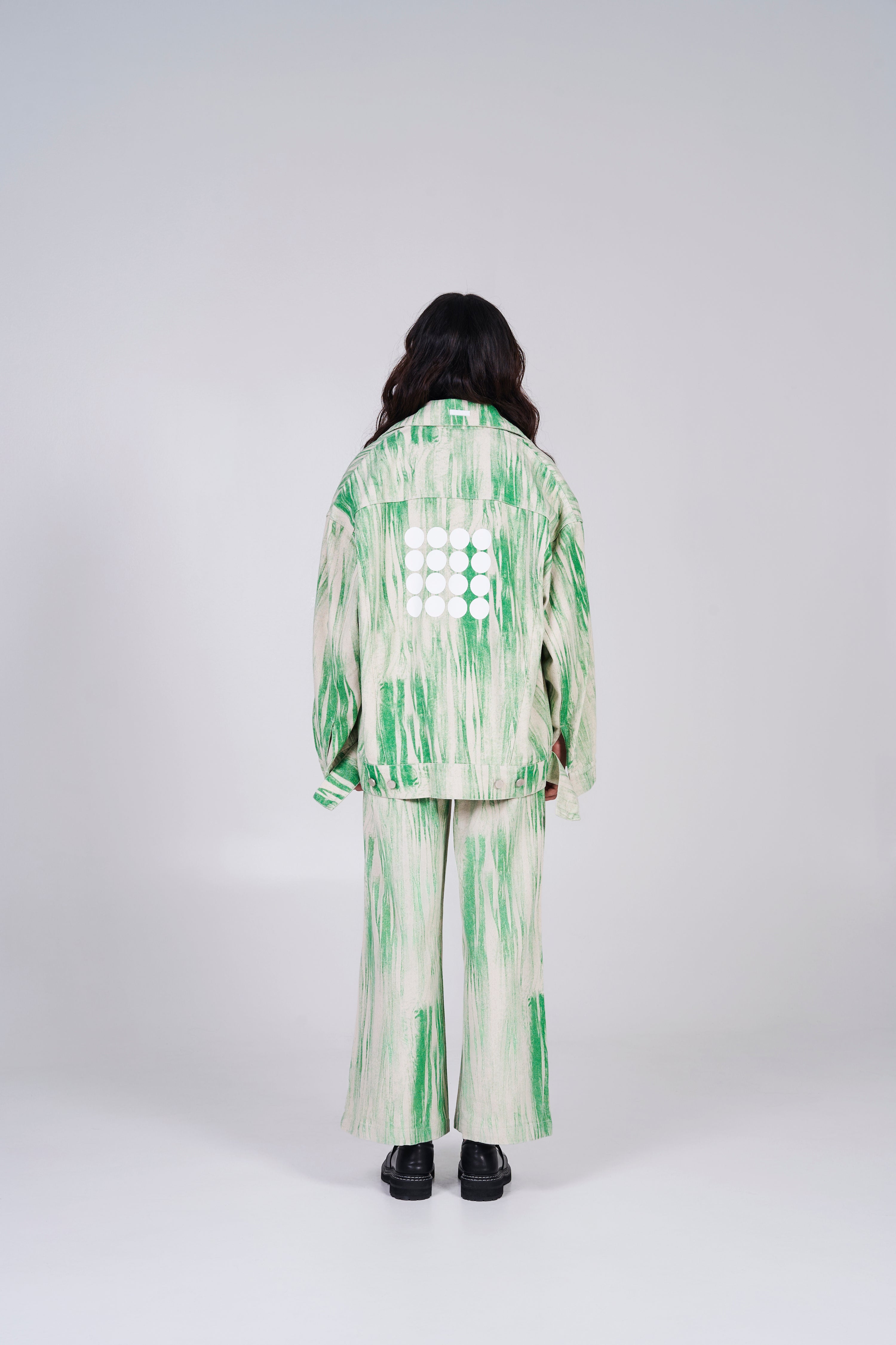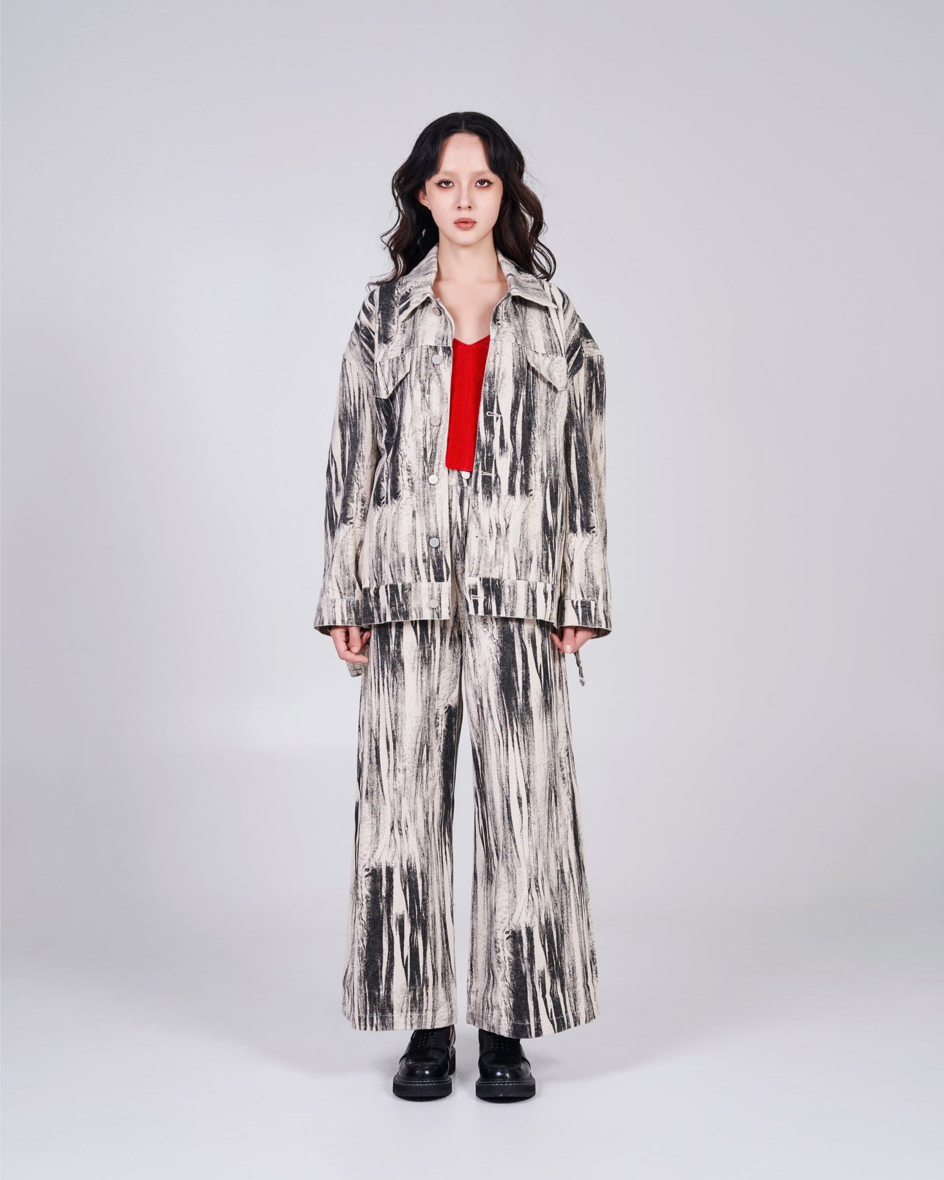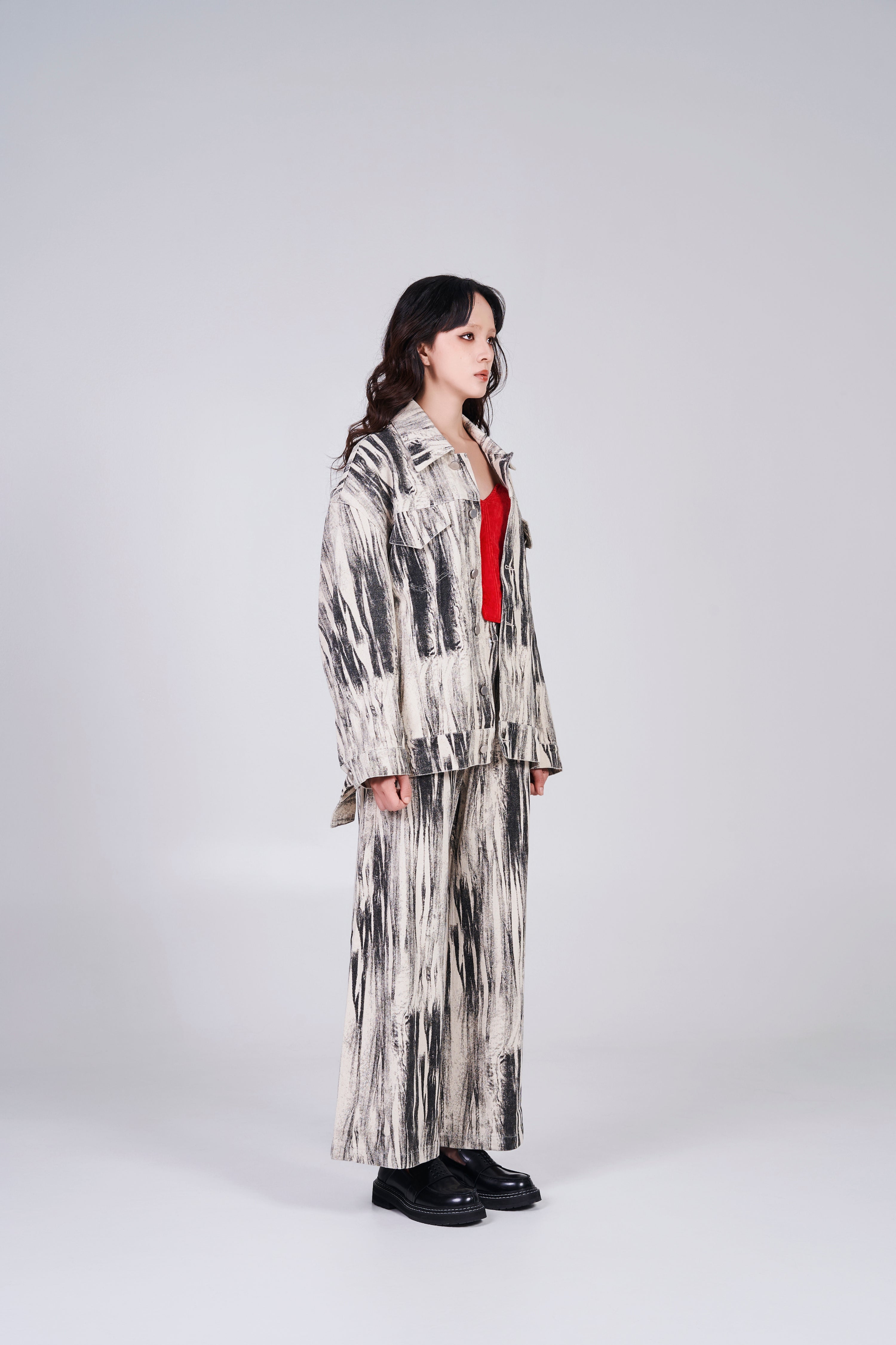 Exclusive for 2024 Lóng Nián. Oversized, distorted print in cotton denim with a collar, buttons down the front and yoke at the front and back. Dropped shoulders, buttoned cuffs, discreet side pockets and flap chest pockets with button. Logo at the back and collar for a pop up of branding.