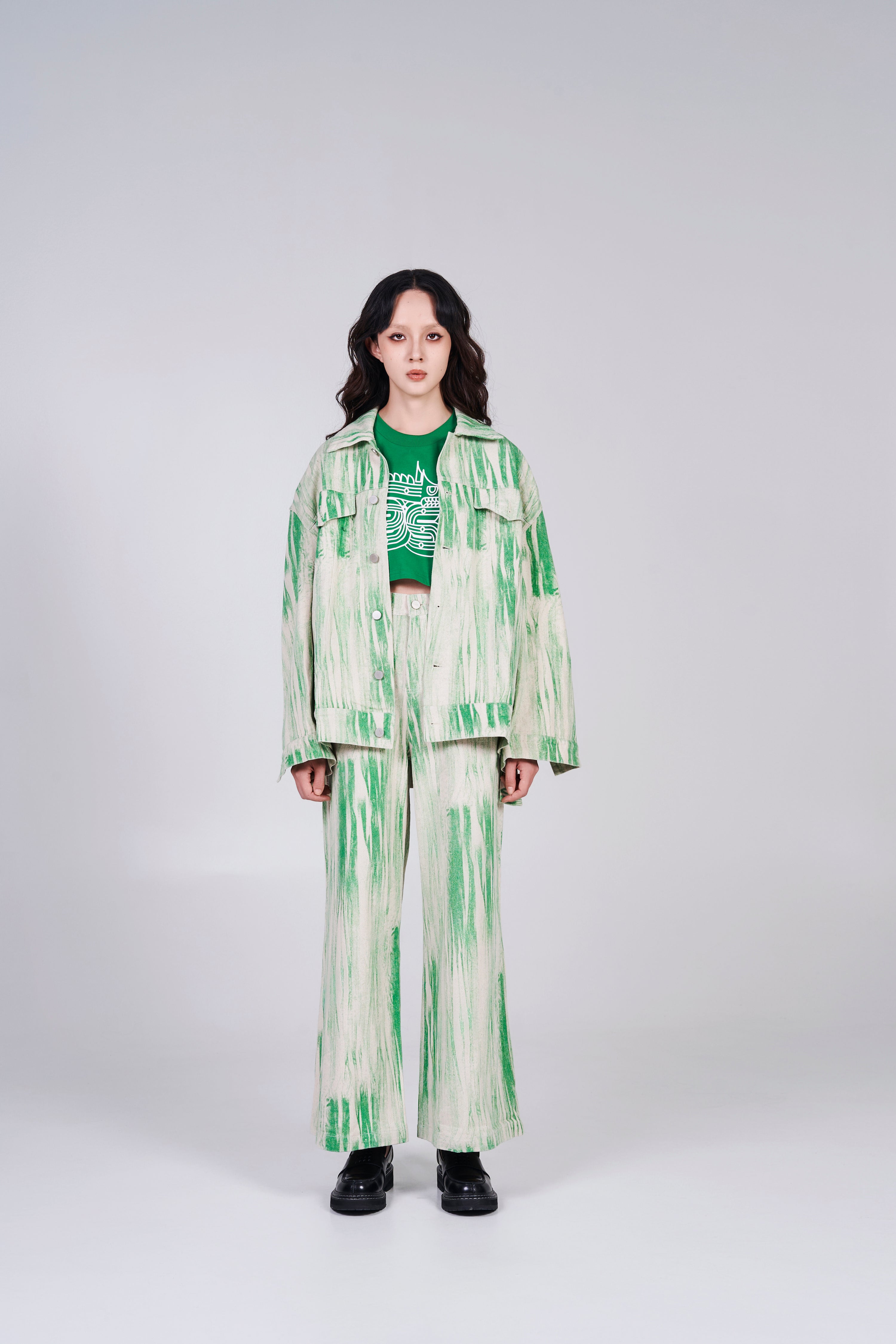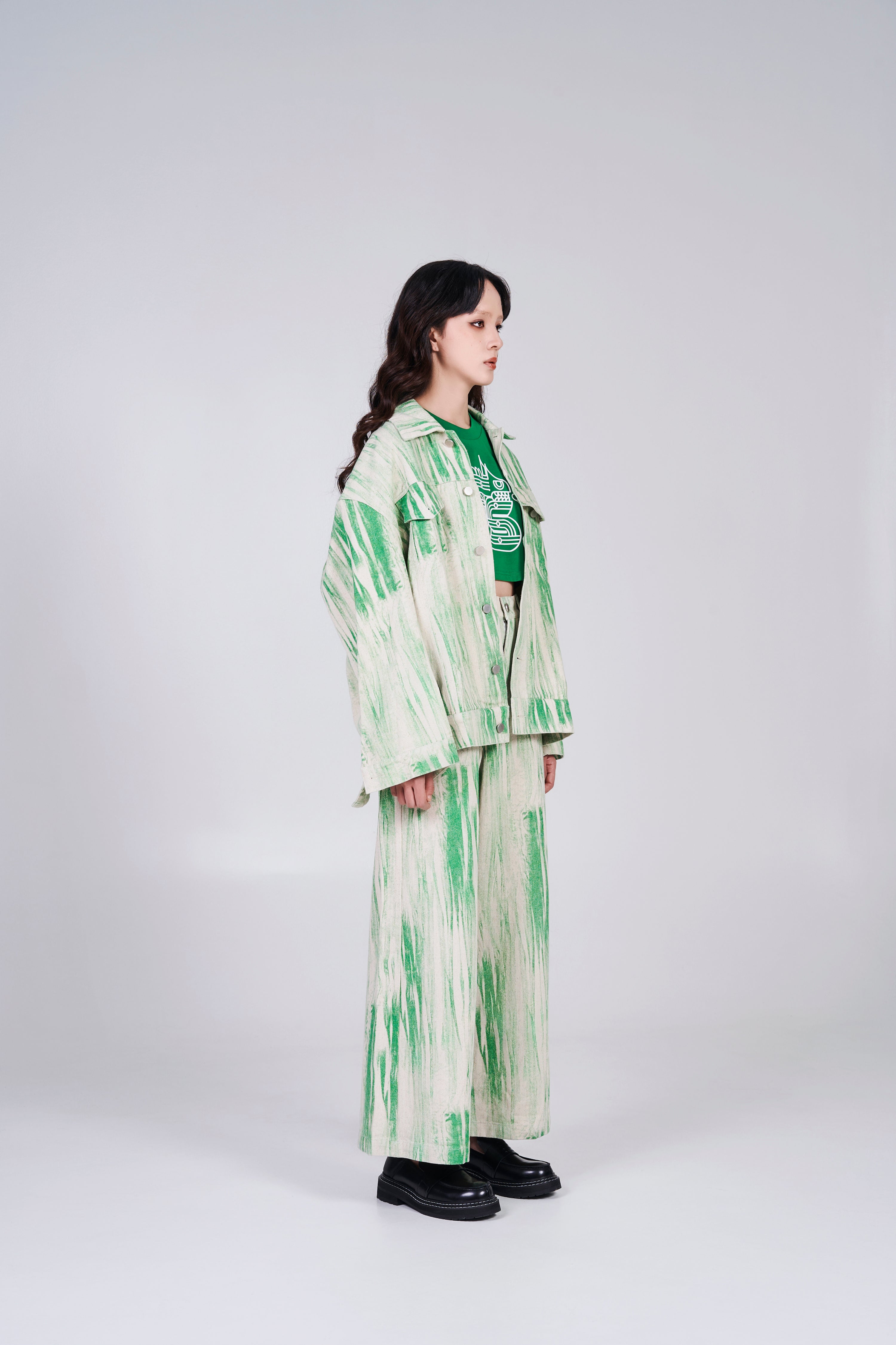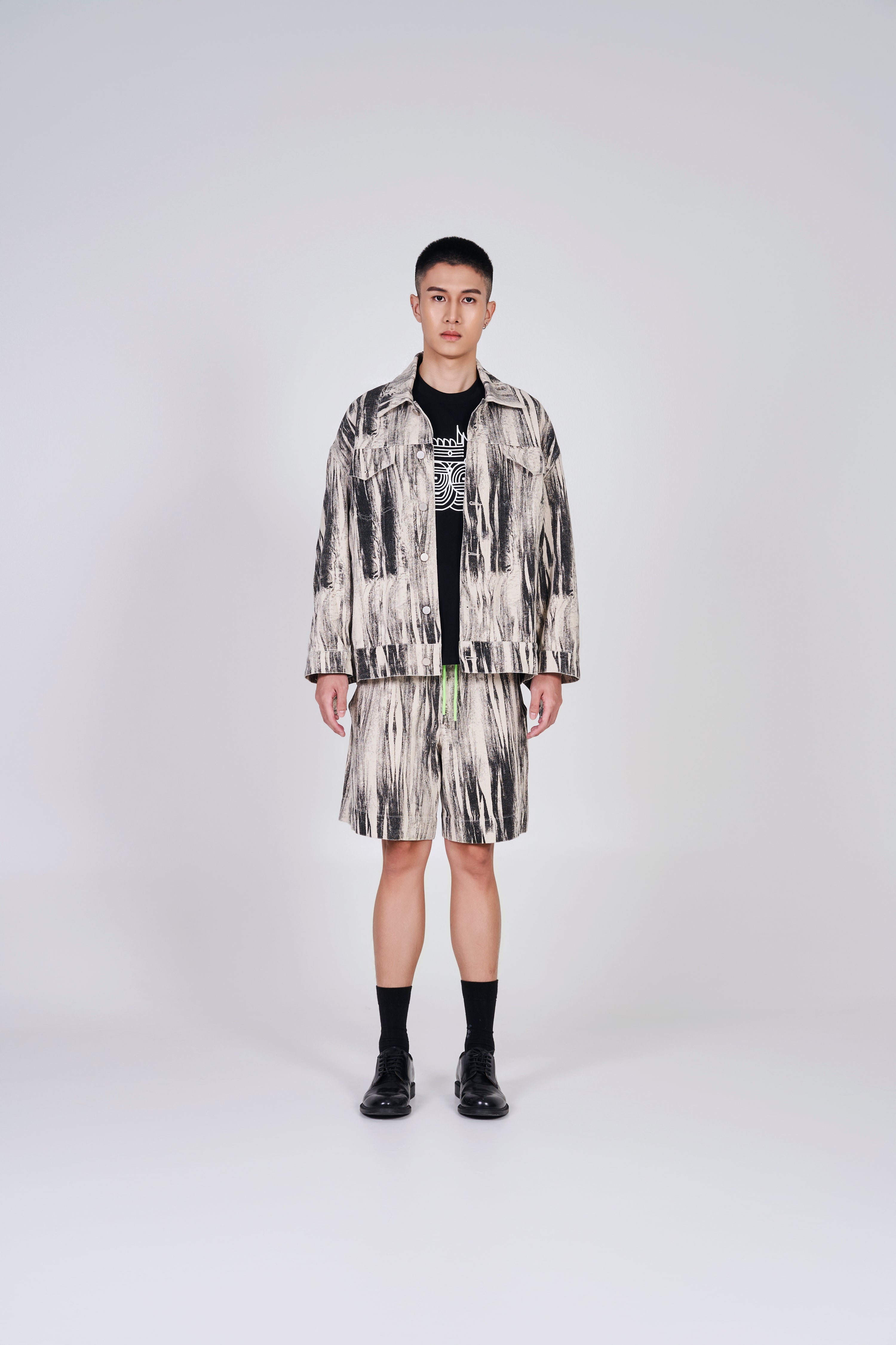 Exclusive for 2024 Lóng Nián. Oversized, distorted print in cotton denim with a collar, buttons down the front and yoke at the front and back. Dropped shoulders, buttoned cuffs, discreet side pockets and flap chest pockets with button. Logo at the back and collar for a pop up of branding.
